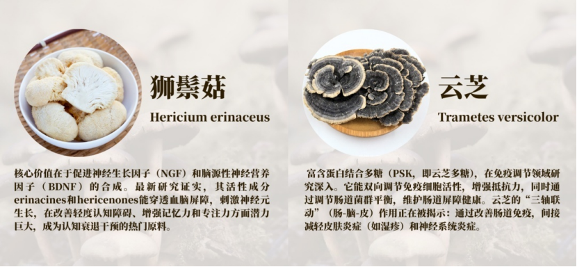 蘑菇提取物正从单一的免疫支持,向基于特定活性成分的精细化功能发展。不同蘑菇种类因其富含的活性多糖(如β-葡聚糖)、麦角硫因、倍半萜等成分差异,展现出独特的靶向作用。